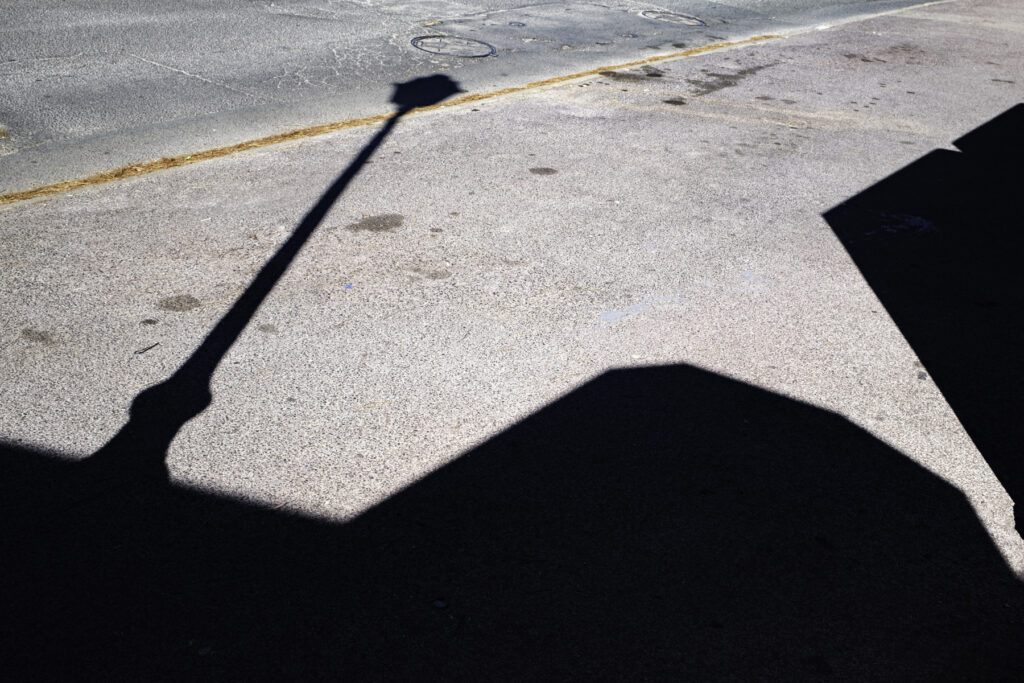 L’ombre élancée du lampadaire traverse le sol comme un trait calligraphique, ponctué par le cercle d’un couvercle de réseau qui sert de point visuel. En bas de l’image, une ombre massive impose sa géométrie et crée un contrepoint graphique fort.