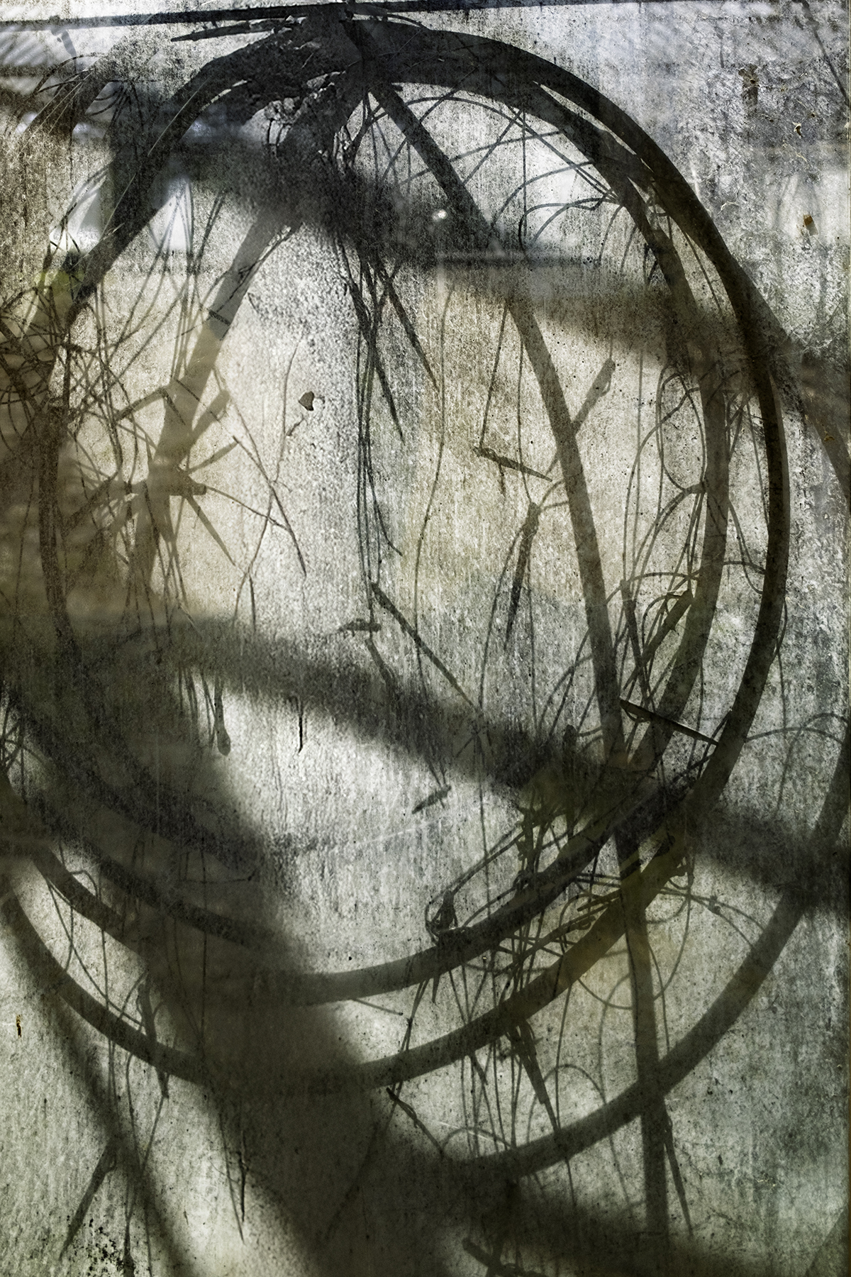 Derrière la surface poussiéreuse du vitrage, des cercles d’ombre se superposent comme des traces fossilisées. Les lignes fines, presque nerveuses, évoquent tour à tour des tiges végétales, des câbles ou les nervures organiques d’une forme inconnue. La matière diffuse du verre adoucit les contrastes, créant une composition où tout semble à la fois présent et voilé.