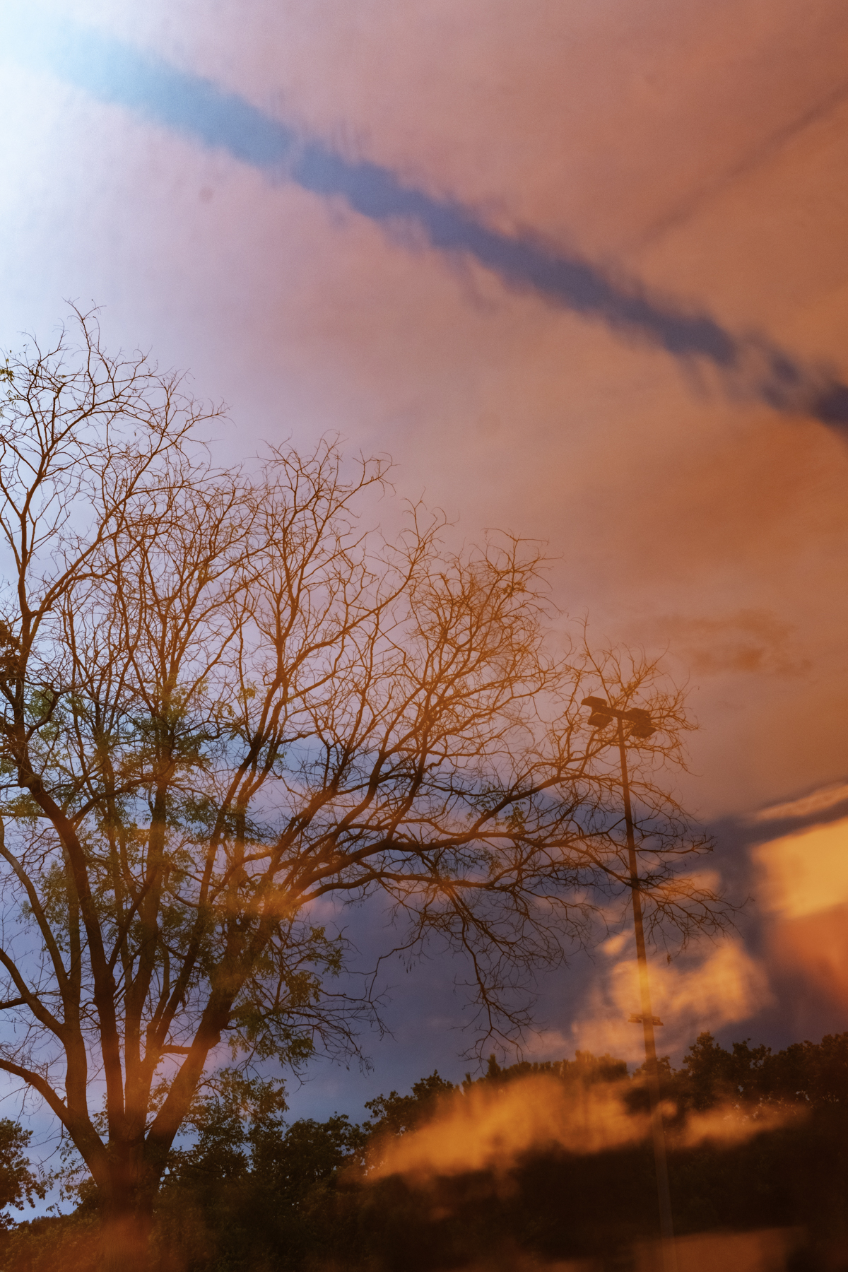 Cette photo joue sur le double plan : un reflet chaud d’une vitre teintée en rouge se superpose au ciel bleu et à la silhouette d’un arbre.