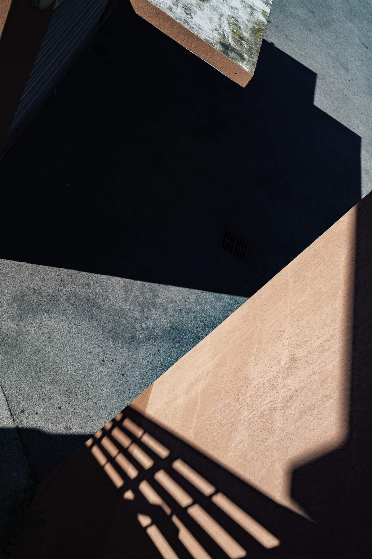 L’ombre élancée du lampadaire traverse le sol comme un trait calligraphique, ponctué par le cercle d’un couvercle de réseau qui sert de point visuel. En bas de l’image, une ombre massive impose sa géométrie et crée un contrepoint graphique fort.