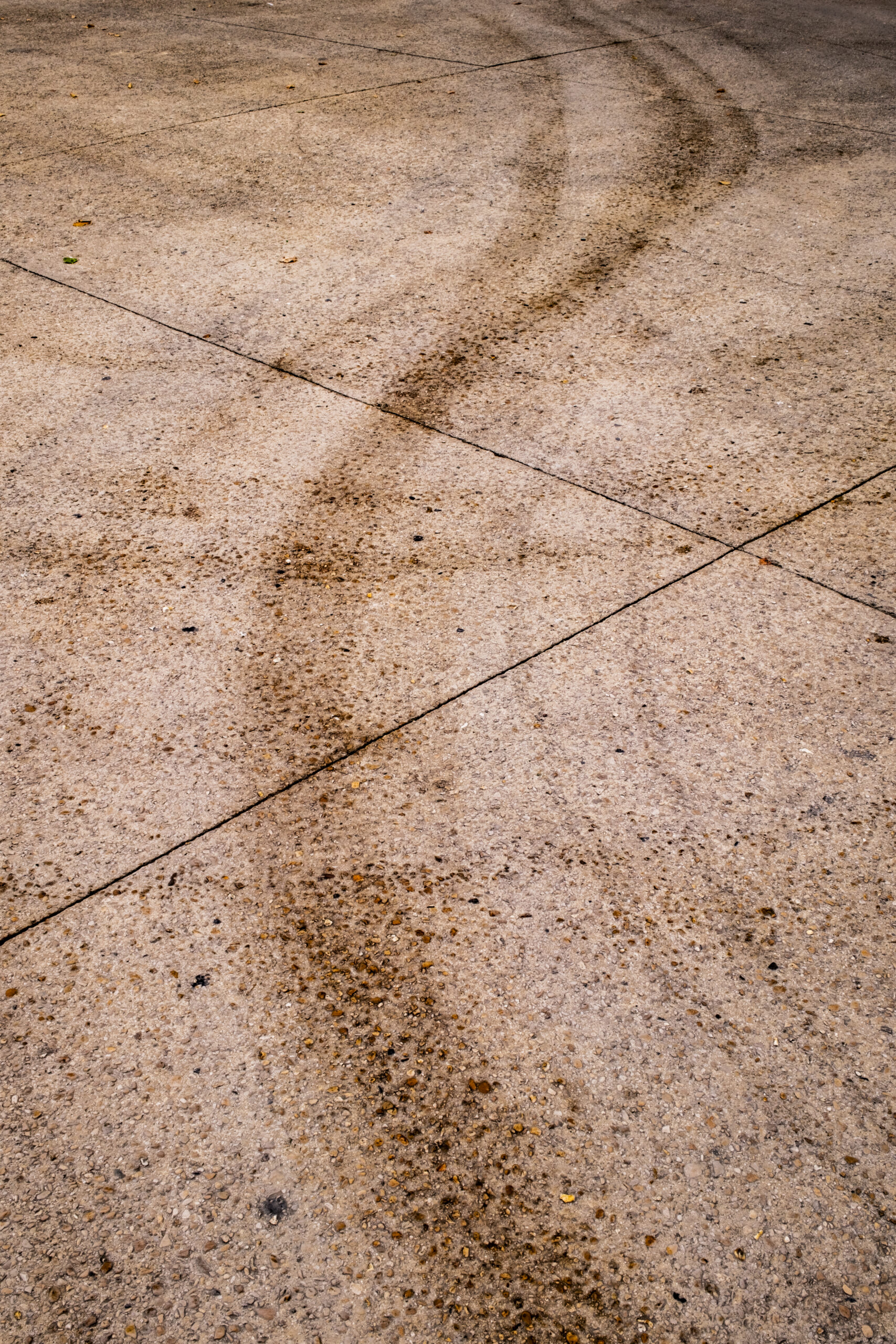 Ici, c’est une trace, un geste involontaire : des traces de pneu deviennent le motif.