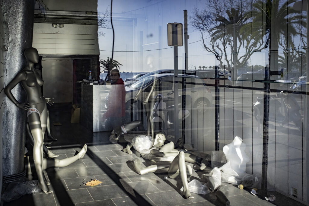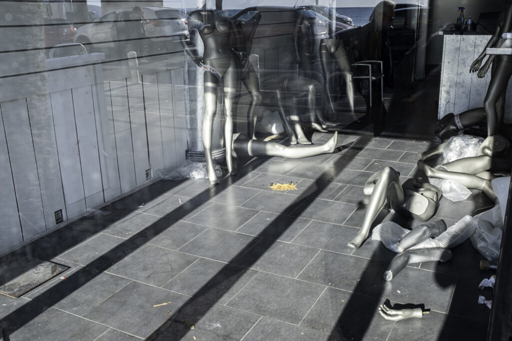 Cette scène se trouvait dans un quartier commercial rempli de vitrines parfaitement achalandées. L’une d’elles, pourtant, était laissée à l’abandon.