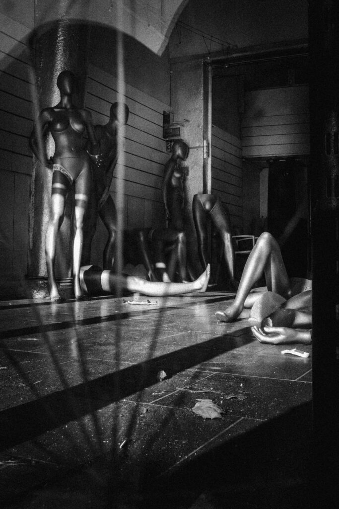 Pour cette étude, j’ai sélectionné une série de clichés réalisés devant une vitrine abandonnée. J’ai d’abord capturé plusieurs versions de la scène, en essayant de comprendre ce qui, dans ce chaos de mannequins désarticulés, me frappait si fortement. Certaines images étaient trop frontales, d’autres trop descriptives, d’autres encore écrasées par les reflets. Elles témoignaient du lieu, mais ne racontaient pas vraiment ce que je ressentais.