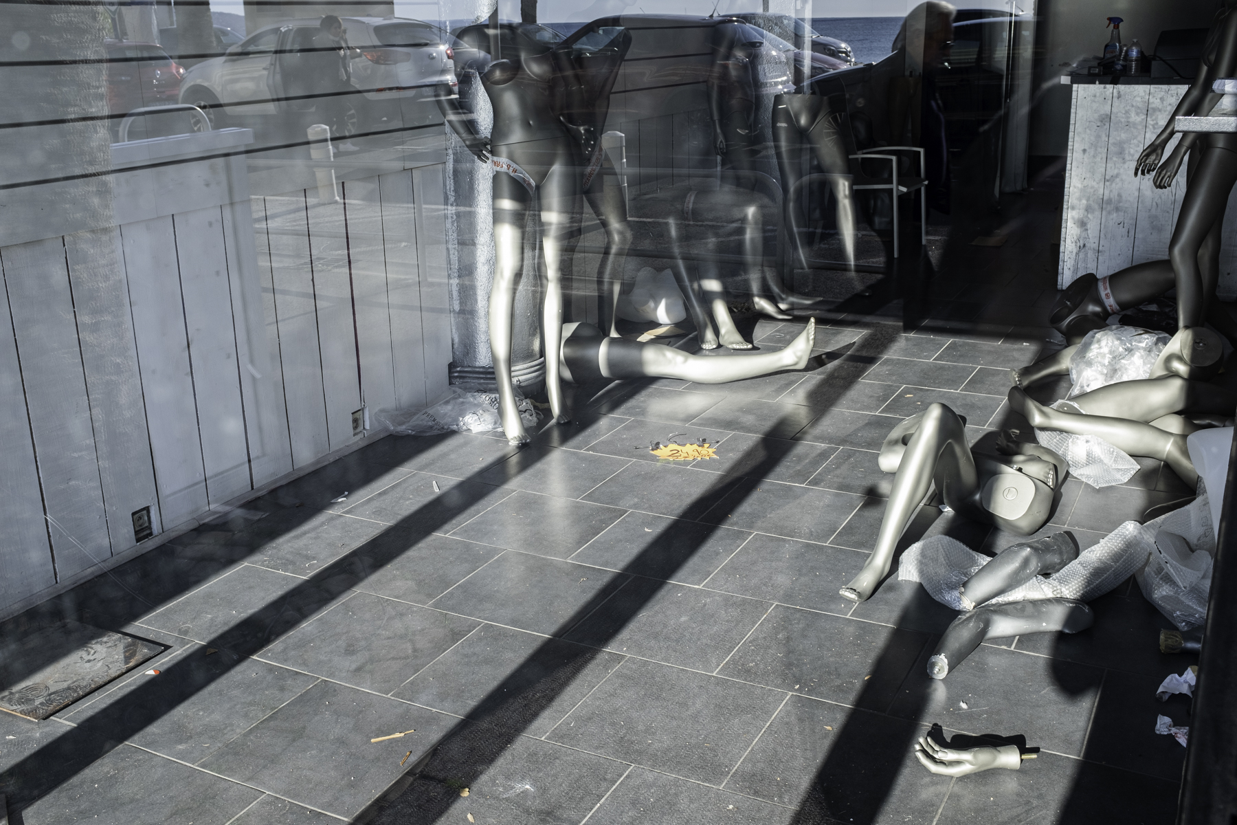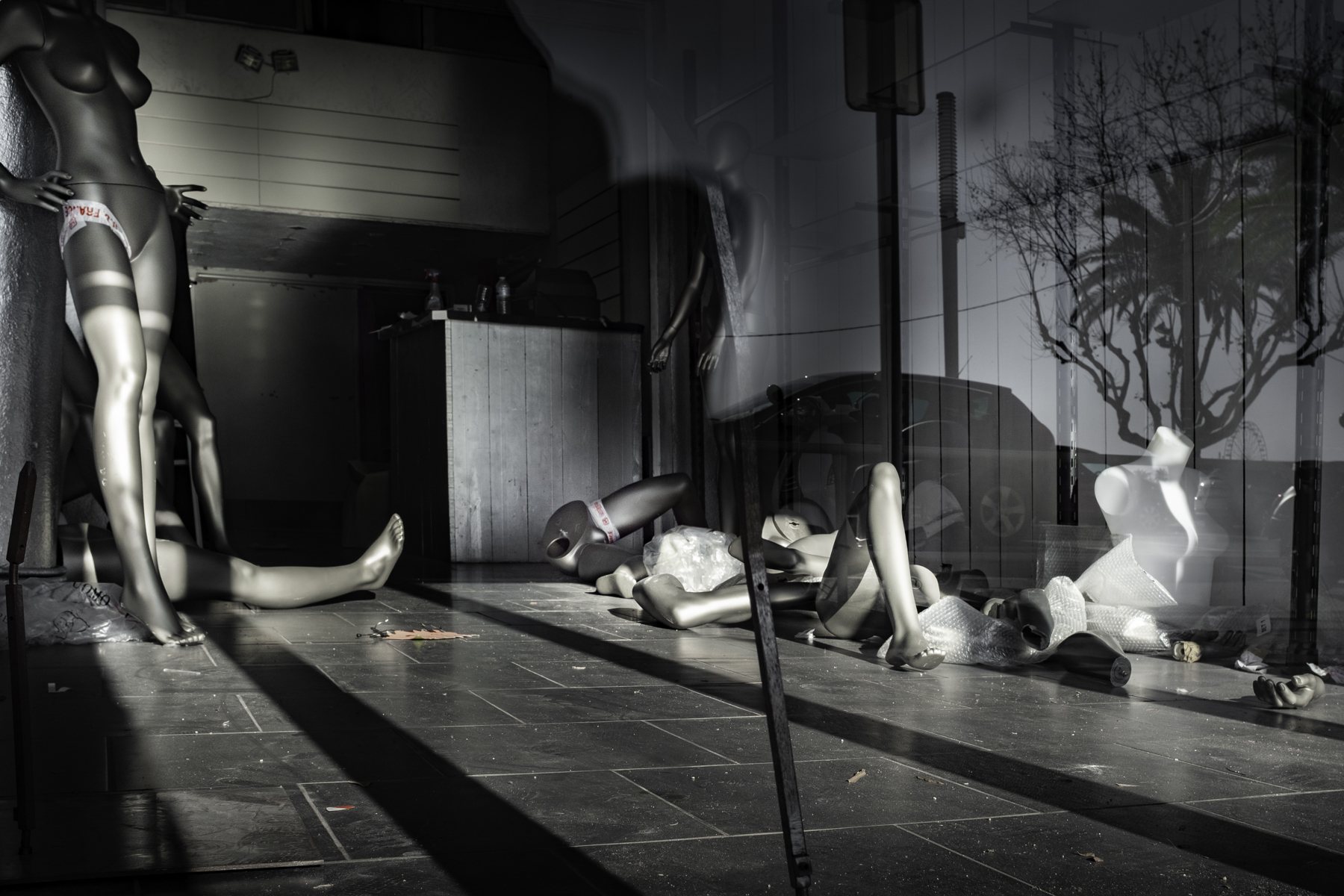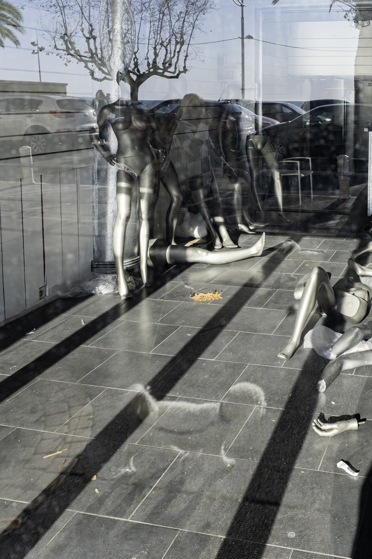 Pour cette étude, j’ai sélectionné une série de clichés réalisés devant une vitrine abandonnée. J’ai d’abord capturé plusieurs versions de la scène, en essayant de comprendre ce qui, dans ce chaos de mannequins désarticulés, me frappait si fortement. Certaines images étaient trop frontales, d’autres trop descriptives, d’autres encore écrasées par les reflets. Elles témoignaient du lieu, mais ne racontaient pas vraiment ce que je ressentais.