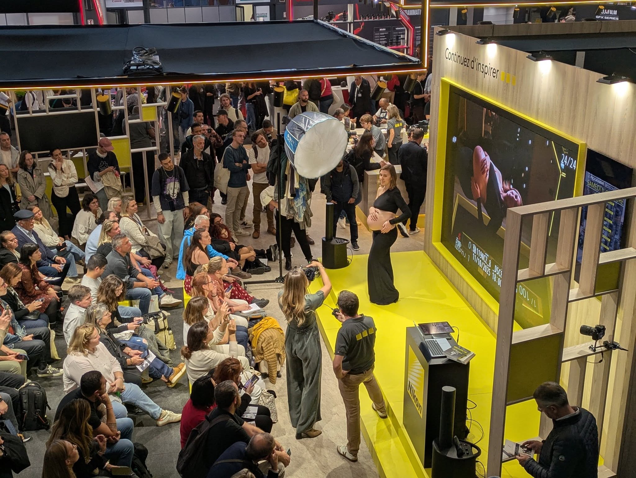 Les “Photo Spots” permettaient de manipuler le matériel en conditions réelles : studio, macro, lumière contrôlée, portrait ou paysage reconstitué. Le salon ressemblait davantage à un immense terrain de jeu qu’à une simple exposition commerciale.